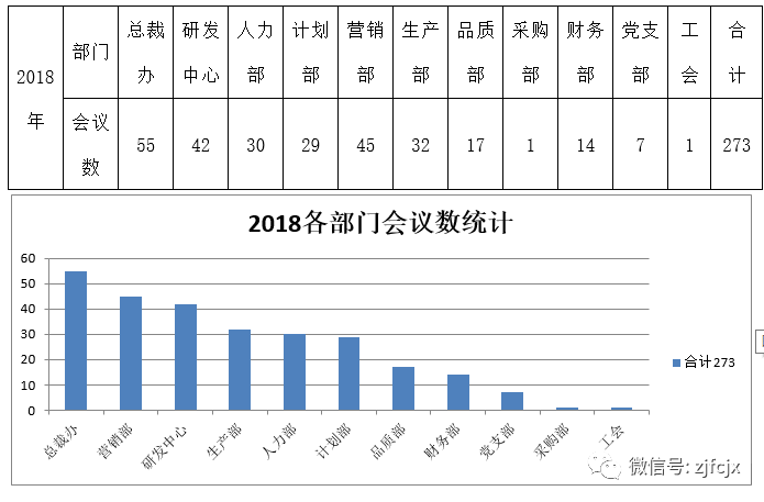 根據(jù)《公司會(huì)議管理制度》規(guī)定要求,各部門需用到公司會(huì)議室的會(huì)議需以《會(huì)議通知》的形式到總裁辦進(jìn)行登記,同時(shí)以《會(huì)議紀(jì)要》的形式到總裁辦進(jìn)行備案。經(jīng)2018年各部門到總裁辦會(huì)議數(shù)統(tǒng)計(jì)如下: